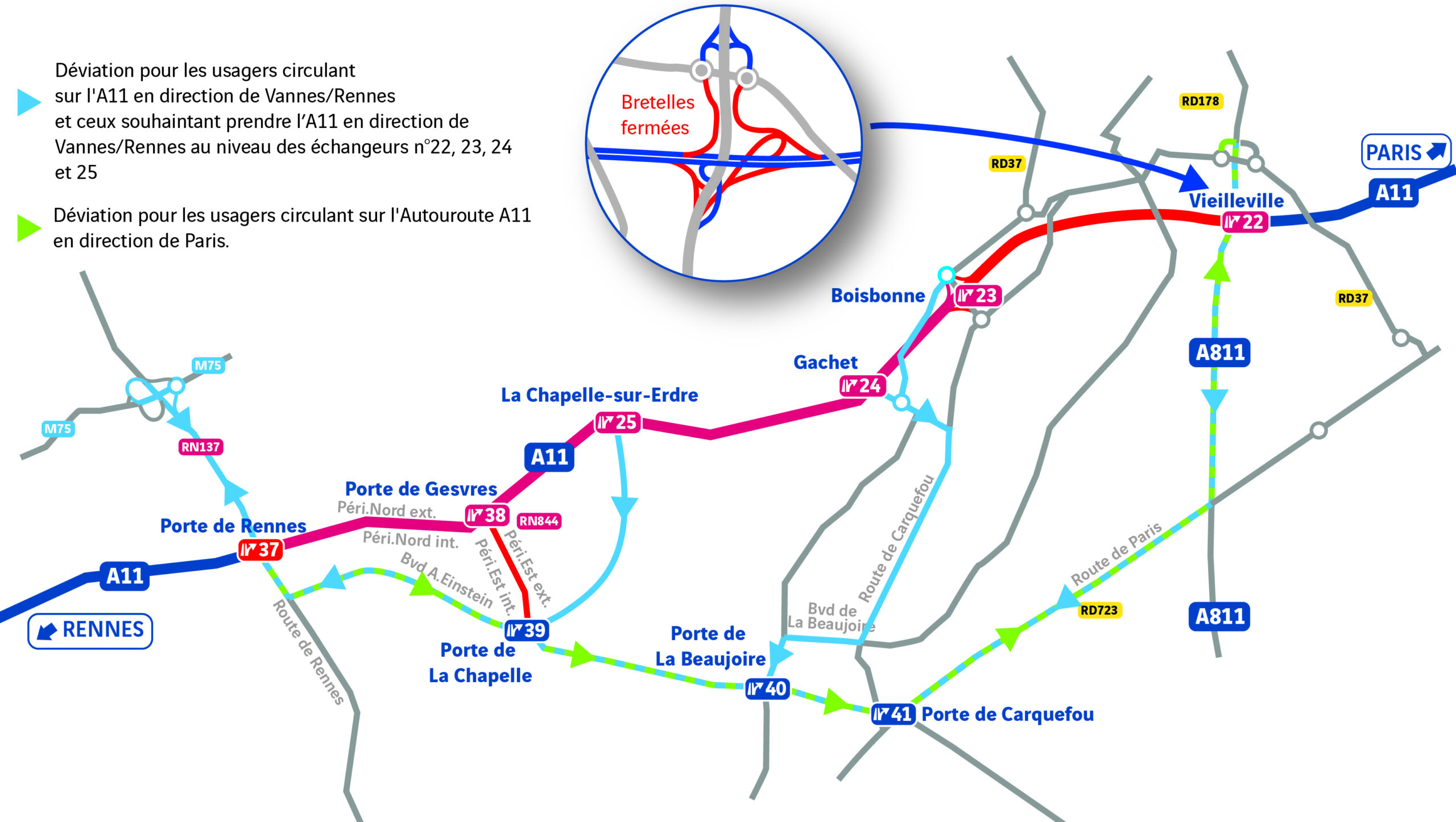 - dans le sens Paris vers Nantes, fermeture de l’autoroute A11 entre l’échangeur de Vieilleville (n°22) et la Porte de Rennes (n°37) ainsi que les bretelles :