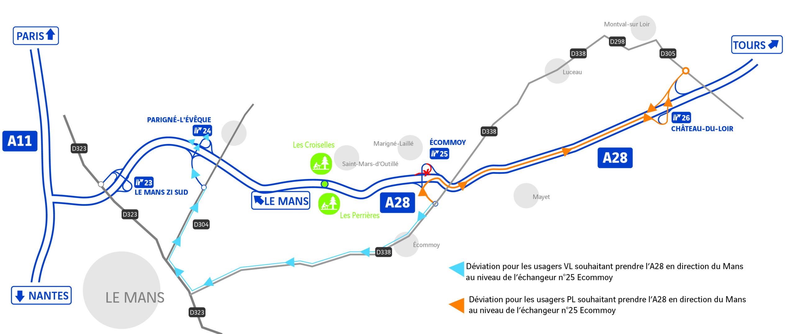 - les conducteurs de poids-lourds souhaitant emprunter l’A28 depuis le secteur d’Ecommoy en direction du Mans devront emprunter la direction de Tours jusqu’à l’échangeur de Château-du-Loir (n°26) et prendre l’A28 en direction du Mans.