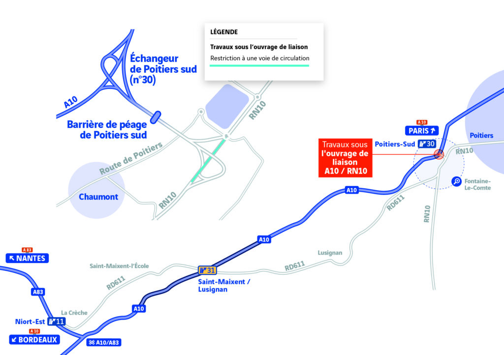 Les travaux d’entretien de l’ouvrage d’art, qui assure les liaisons entre l’autoroute A10 et la RN10 au niveau de l’échangeur de Poitiers sud (n°30), se poursuivent sous l’ouvrage et sur la RN10 jusqu’au vendredi 12 décembre 2025. Durant cette période, sur la RN10, la circulation sera maintenue sur une voie, jour, nuit et week-end.