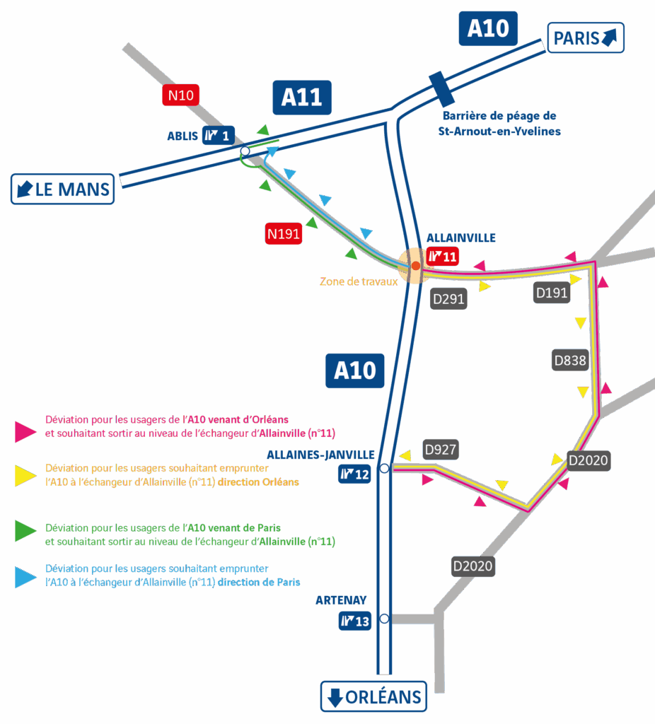 - les conducteurs en direction de Tours / Orléans devront rejoindre l’entrée Allaines / Janville (n°12) via la RD291, la RD191, la RD838, la RD2020, et la RD927.