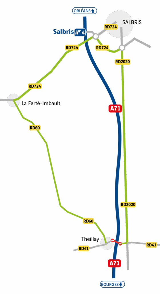 RD41 au niveau du pont franchissant l’A71. Une déviation sera mise en place via la RD41, la RD60,