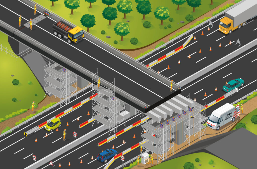 Pour mener à bien le remplacement des appareils d’appui, il est nécessaire de soulever le tablier de l’ouvrage. Des vérins hydrauliques sont ainsi installés au plus près des appareils d’appui. Ils ont pour fonction de lever ou descendre le tablier de quelques centimètres pour permettre l’intervention du personnel de chantier au niveau des appareils d’appui. Cette phase essentielle et très technique du chantier est appelée opération de vérinage.